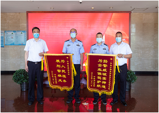 8月10日上午,集团公司培训中心主任孔德明、工会主席郑春梅、租赁公司副总经理刘秀举、综合管理部助理孟醒代表玩加电竞·(中国)官方网站来到北京市公安局怀柔分局,为怀柔分局雁栖经济开发区派出所和怀柔分局刑侦支队赠送锦旗,锦旗上分别绣有“扬警威破案神速,为企业保驾护航”、“为人民服务,展刑警雄风”的大字,对此次成功破获我集团租赁公司失窃案的全体民警、刑侦警官表示由衷的感谢!